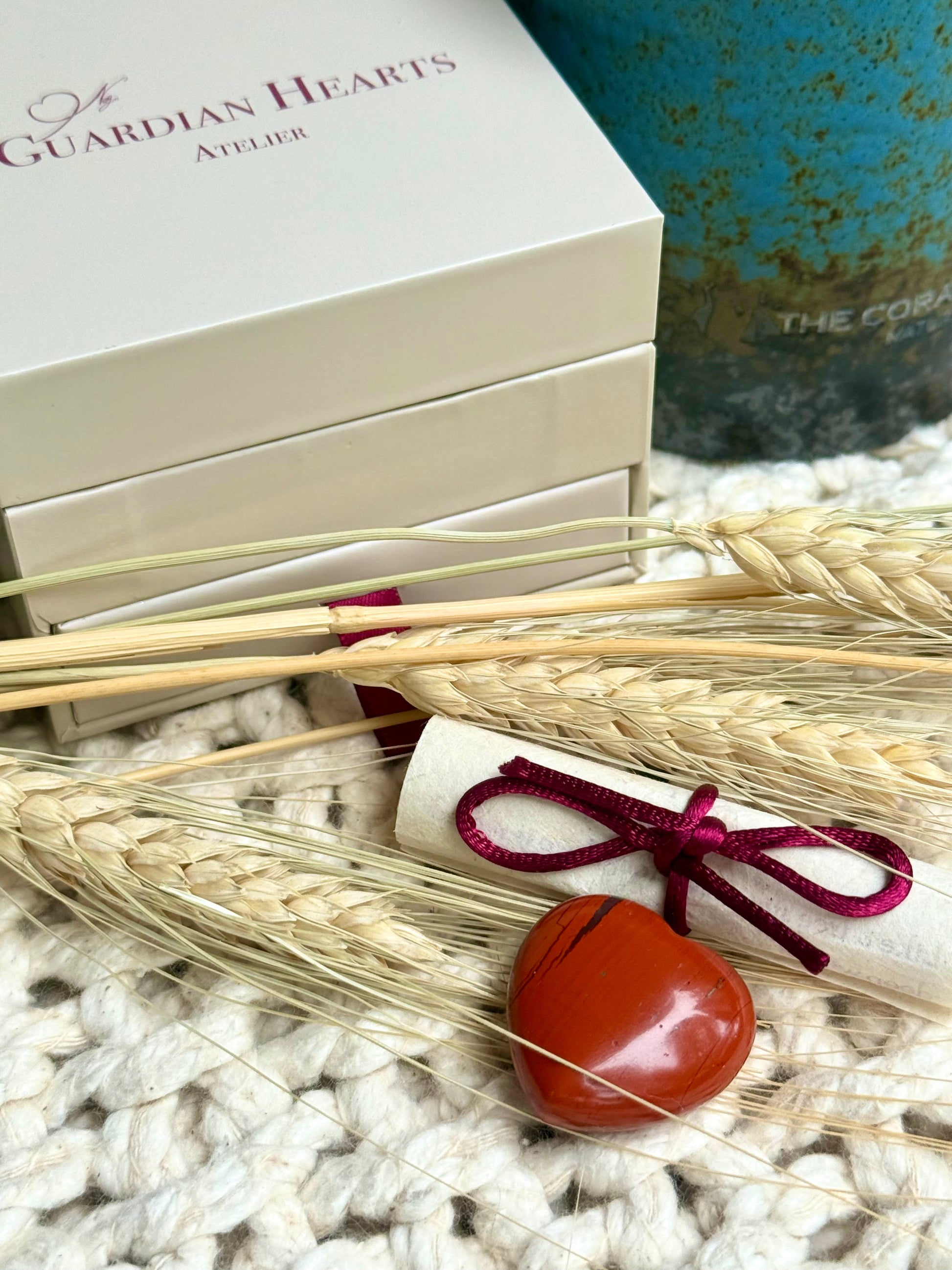 The Forgiveness Heart is carved from Red Jasper and is presented in a luxurious custom box, nestled in silk with its unique message hand-rolled and printed on natural Lokta paper. A hidden drawer reveals a velvet pouch so you can carry your heart wherever you go.